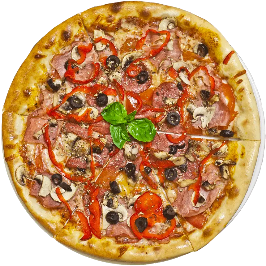Sauce tomate, jambon blanc, mozzarella, oignons, poivron, maïs, olives